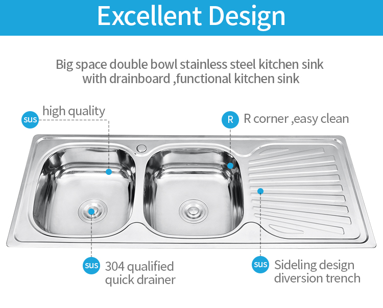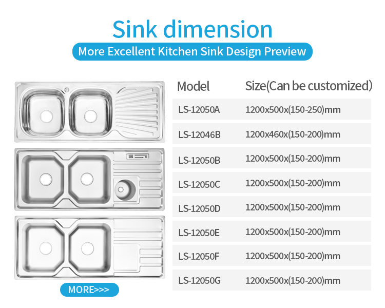 መጠን 1200 * 500 ሚሜ, 48 * 20 ኢንች, ጥልቀት እና ውፍረት ሊበጁ ይችላሉ.ድርብ ጎድጓዳ ሳህን ከውሃ ማስወገጃ ሰሌዳ ጋር።አሁን ይህ የናሙና ወለል ንጣፍ በማጠናቀቅ ላይ ሲሆን ይህም "ፐርል አሸዋ" ተብሎ ይጠራል.እንደ ማበጠር እና መቦረሽ ያሉ ብጁ ማጠናቀቂያዎችን እንቀበላለን።ይህ ሞዴል እንደ ቀላል የቤተሰብ አጠቃቀም ወጥ ቤት ወይም የንግድ ኩሽና በቆመበት ላይ ሊጫን ይችላል.የተለያዩ ደንበኞችን ፍላጎት ለማሟላት፣ ለዚህ መጠን 10 የተለያዩ ንድፎችን መርምረናል።